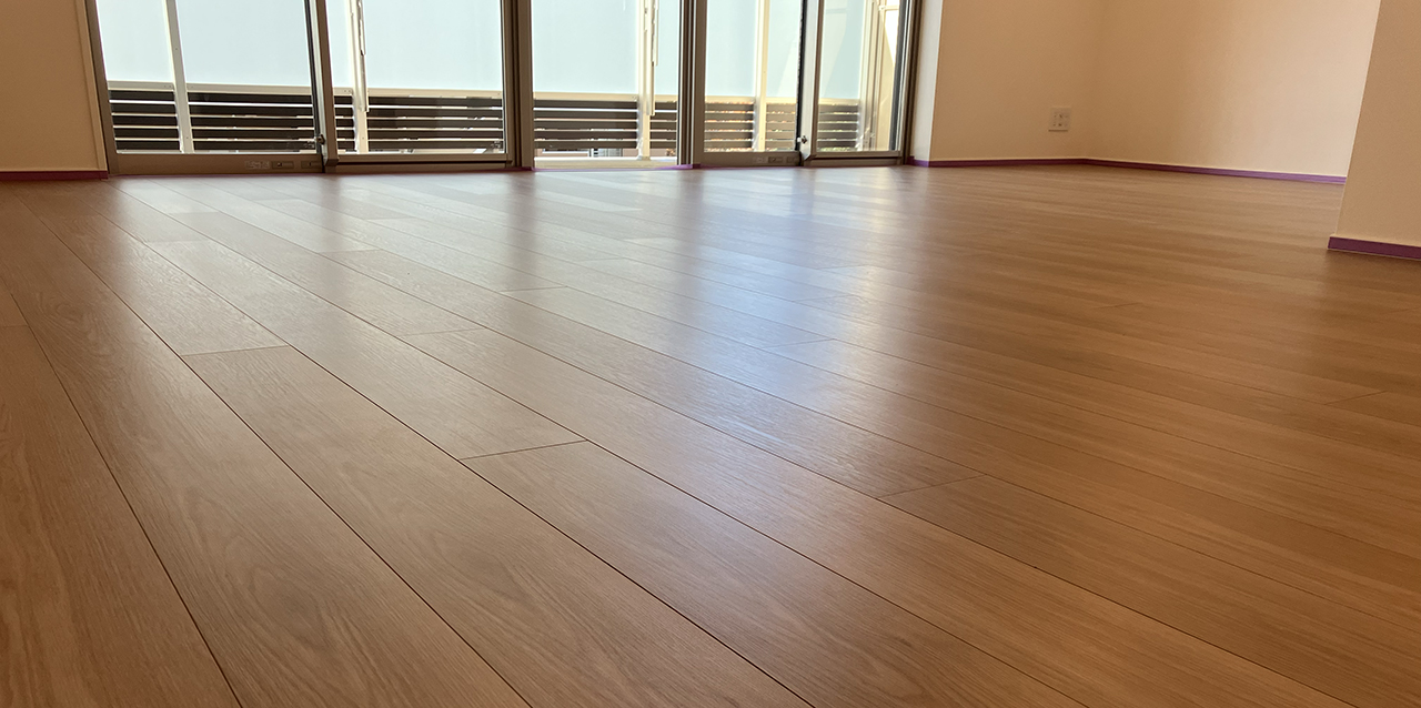 UVコーティングは高級感のあるツヤが美しい仕上がりになります。ツヤが気になる場合はツヤ感を抑えた半ツヤUVコーティングも人気です。フロアの上にコーティングすることで元々あった微細な傷が目立ちにくくなるメリットもございます。