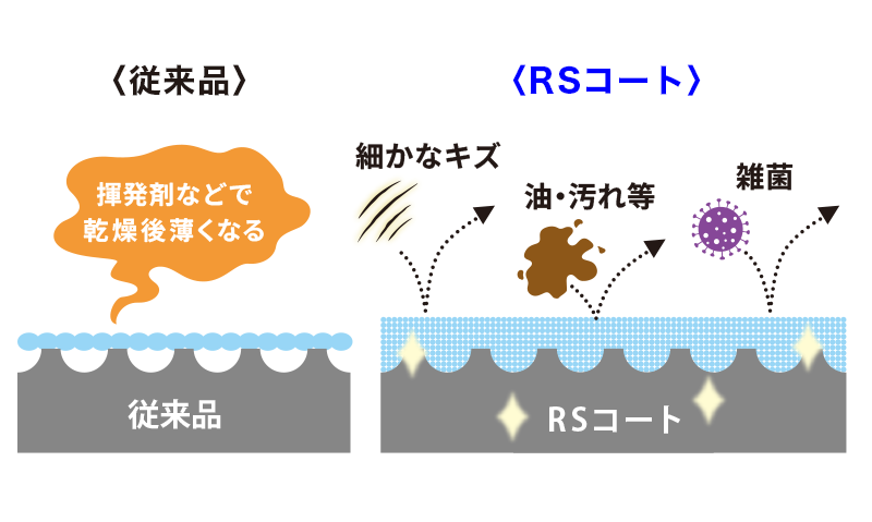 RSコートは市販にはない高濃度のガラスコーティング剤です。 コーティング面は抗菌仕様になり汚れや水垢の定着も防ぎ、劣化も防止します。汚れがついてしまっても、力を入れずに簡単に落とすことができるようになります。